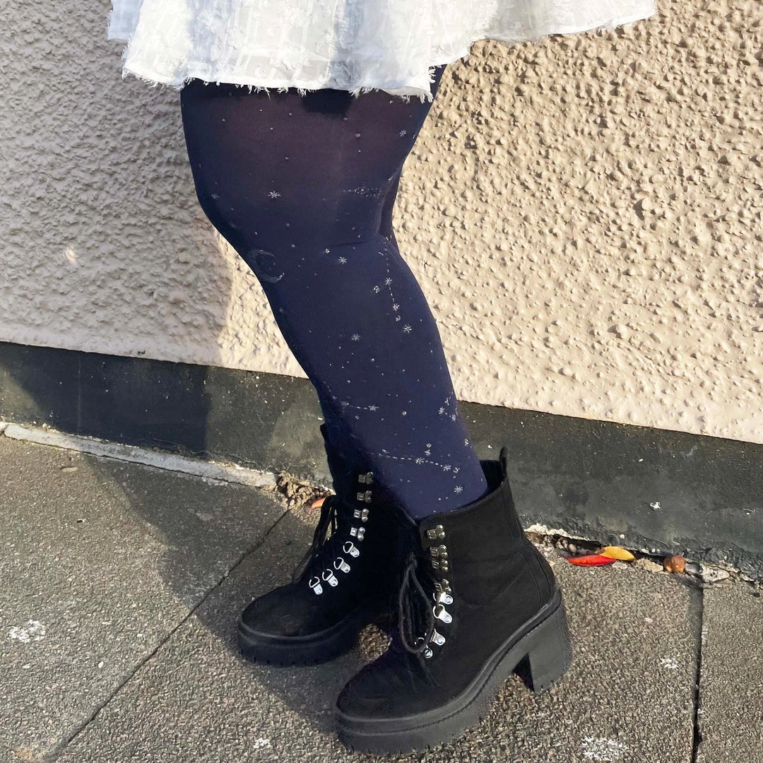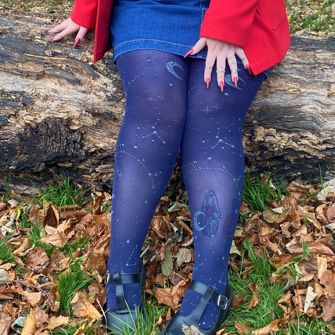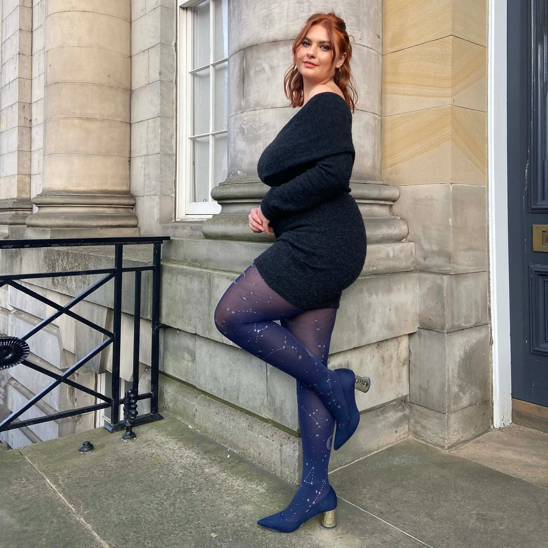 Knock ’em dead in this frightfully fabulous pair of navy and silver tights! Pair with with any outfit, toned up or down, for a bewitching look!