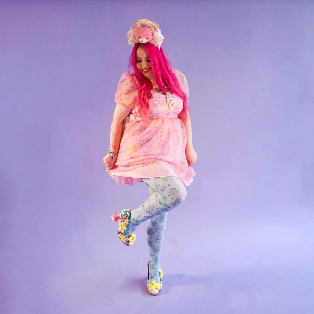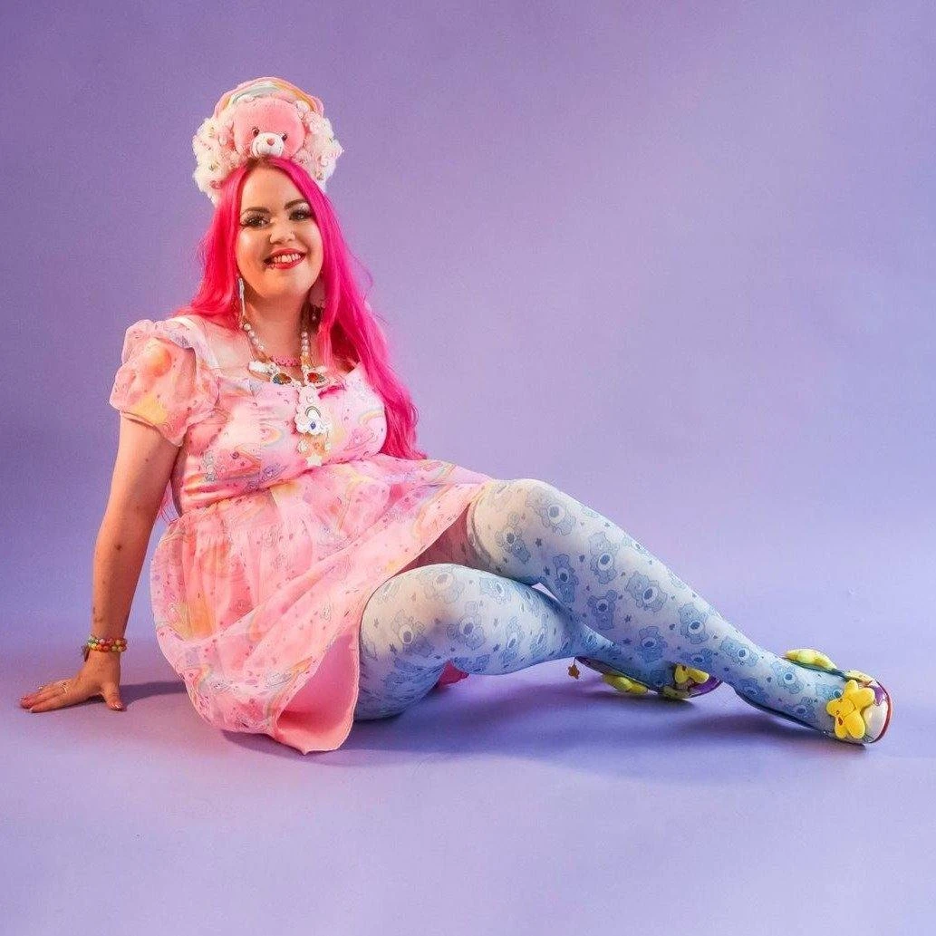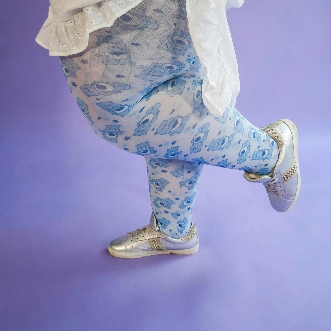 Our Care Bear tights are hand-printed and hand-sewn rather than knitted. If we knitted them, they wouldn’t have visible seams and the pattern would line up however you would lose almost all the details of the bears which is why we opt for printing.