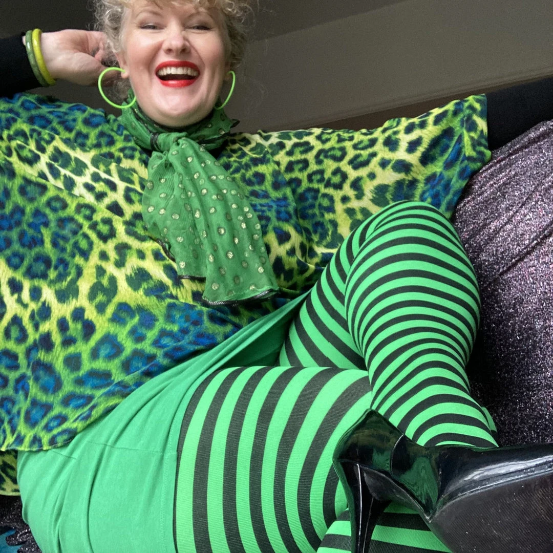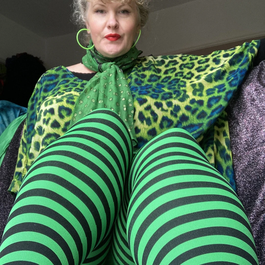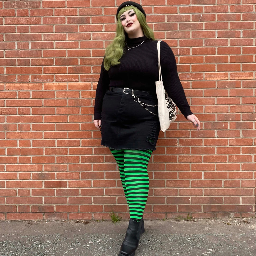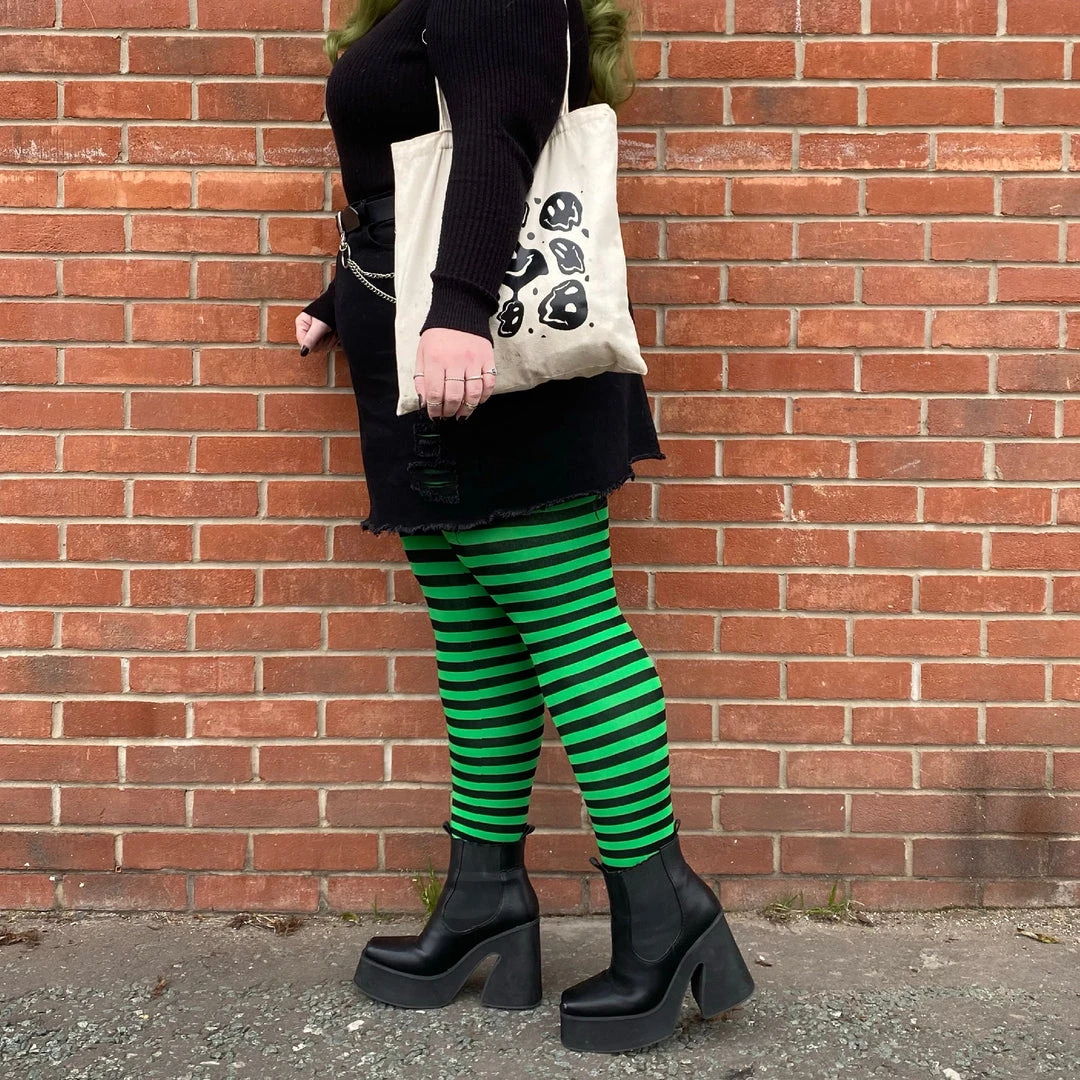 Get everyone under your spell in these green and black striped tights! Perfect for a witchy costume but even better for releasing your inner witch and letting everyone know who you truly are! These pair beautifully with black, white, denim and other greens!