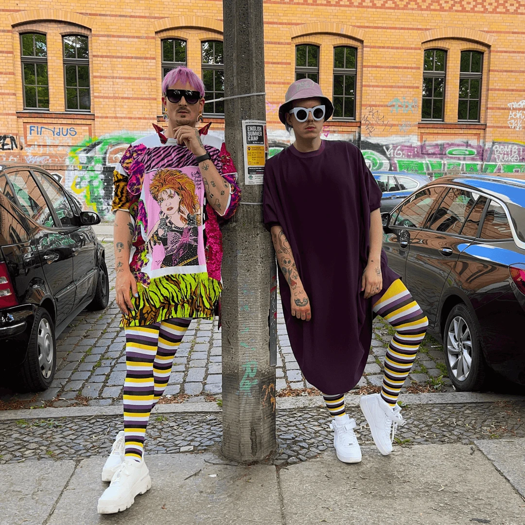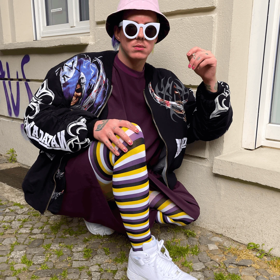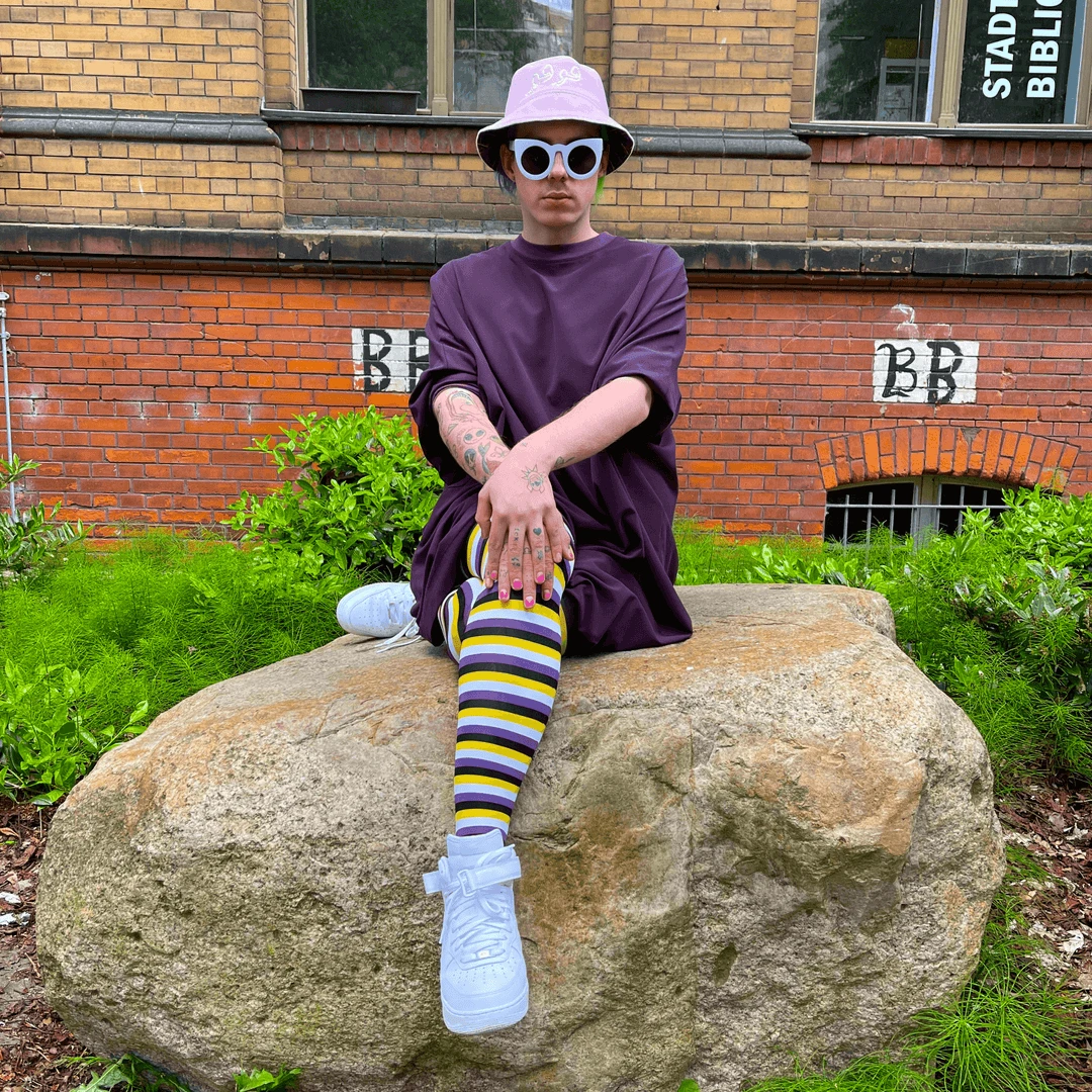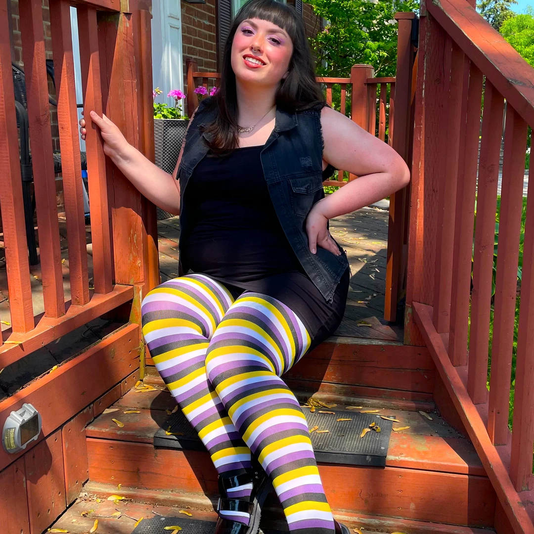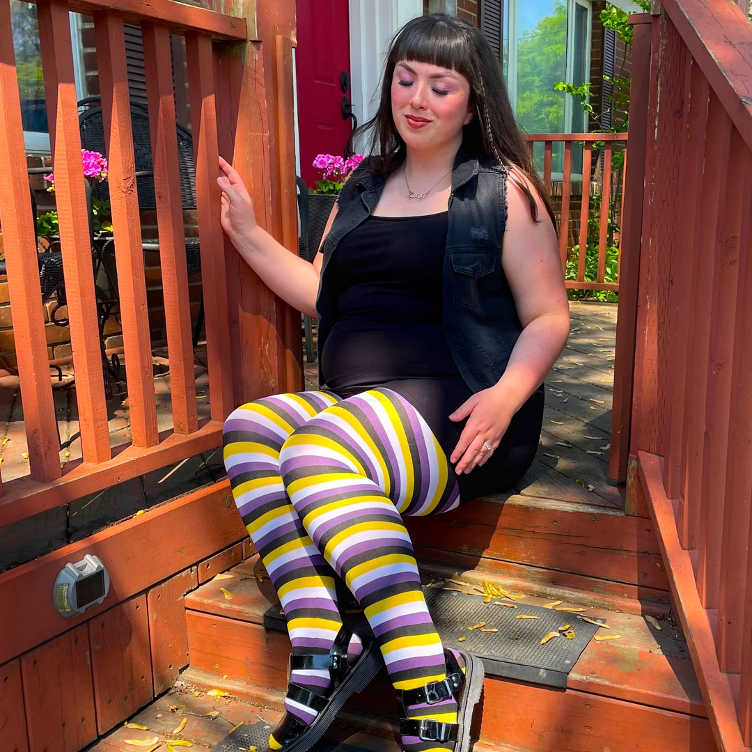 Create a striking look with these purple, yellow, black and white striped tights inspired by the non-binary flag. Share the love with Elliot and wear your Pride on your legs in these buttersoft beauties.
