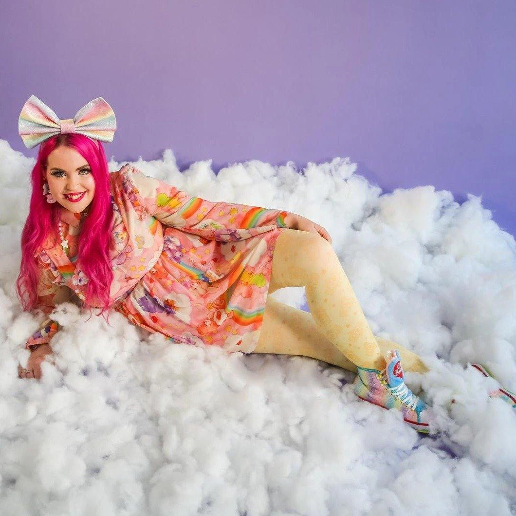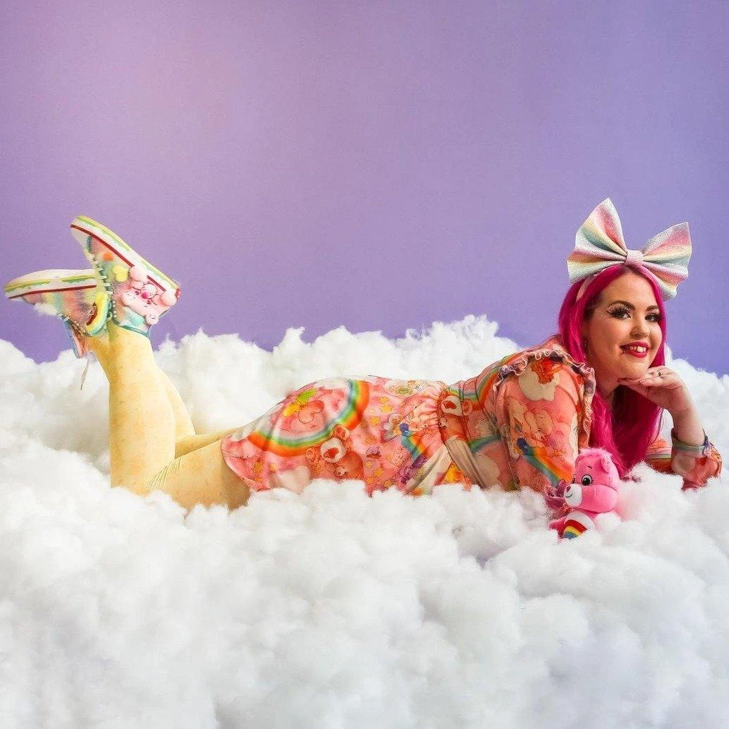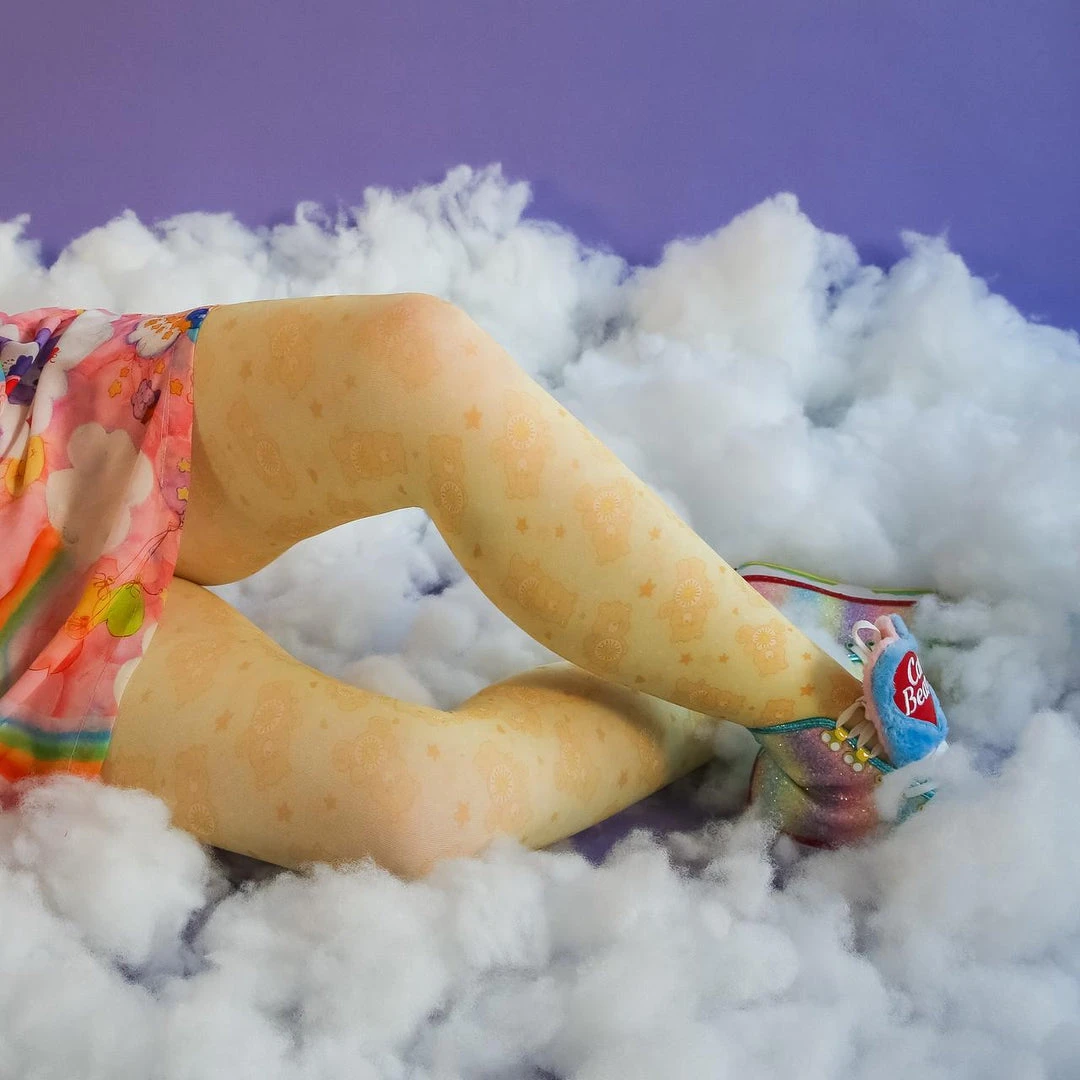 Our Care Bear tights are hand-printed and hand-sewn rather than knitted. If we knitted them, they wouldn’t have visible seams and the pattern would line up however you would lose almost all the details of the bears which is why we opt for printing.