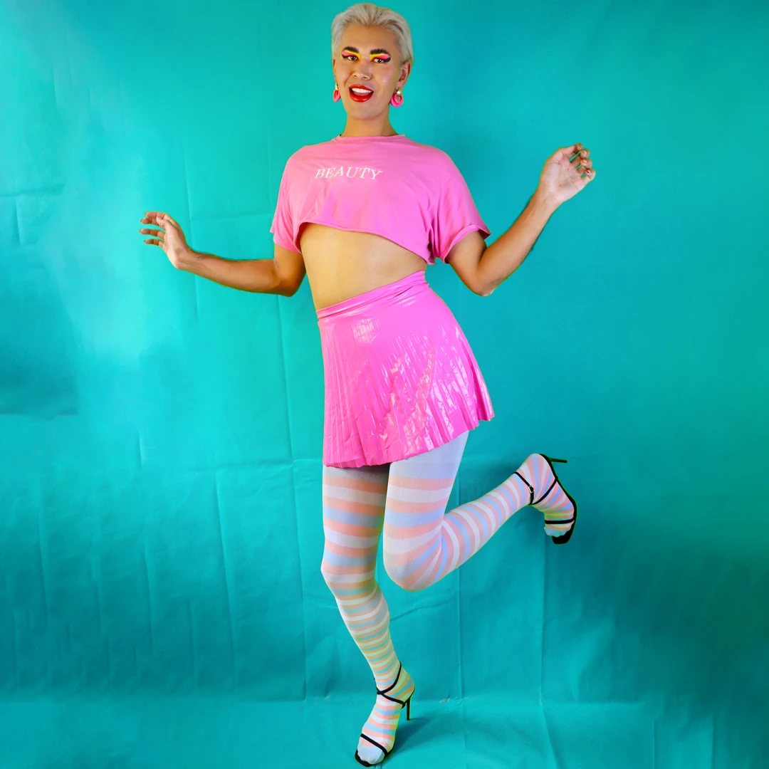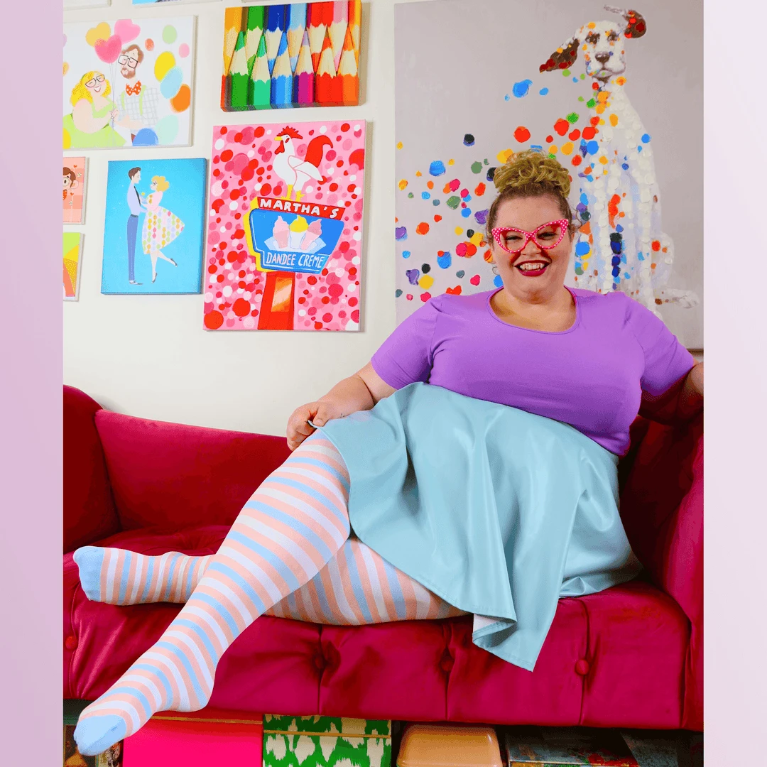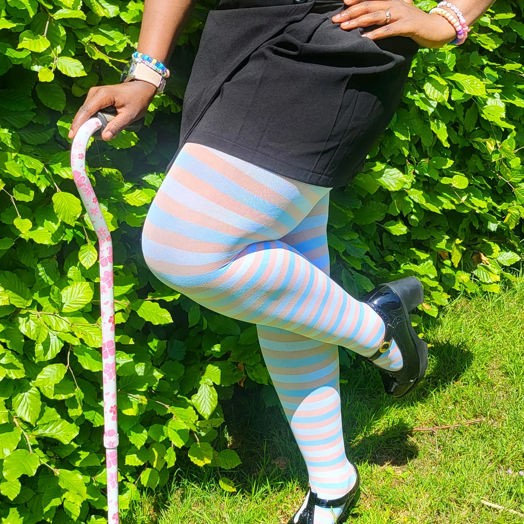 Look lovely in Laverne our pink, blue and white Pride tights inspired by the beautiful colours of the Trans flag. Wear your Pride on your legs all year round with these colourful, butter soft striped tights.
