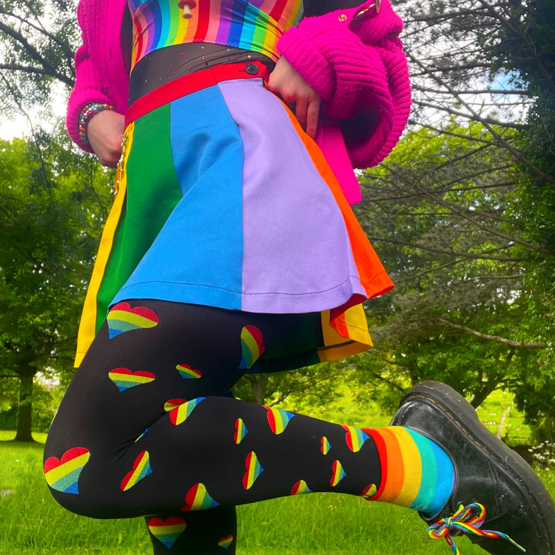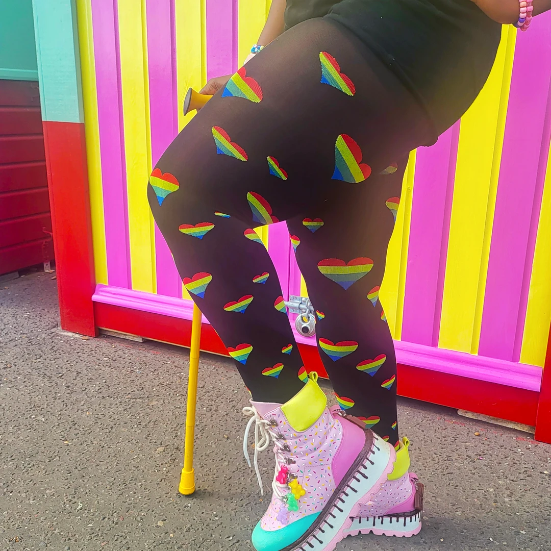 Love is Love – need we say more? Celebrate Pride in style in classic black buttersoft tights with a knitted rainbow loveheart pattern.