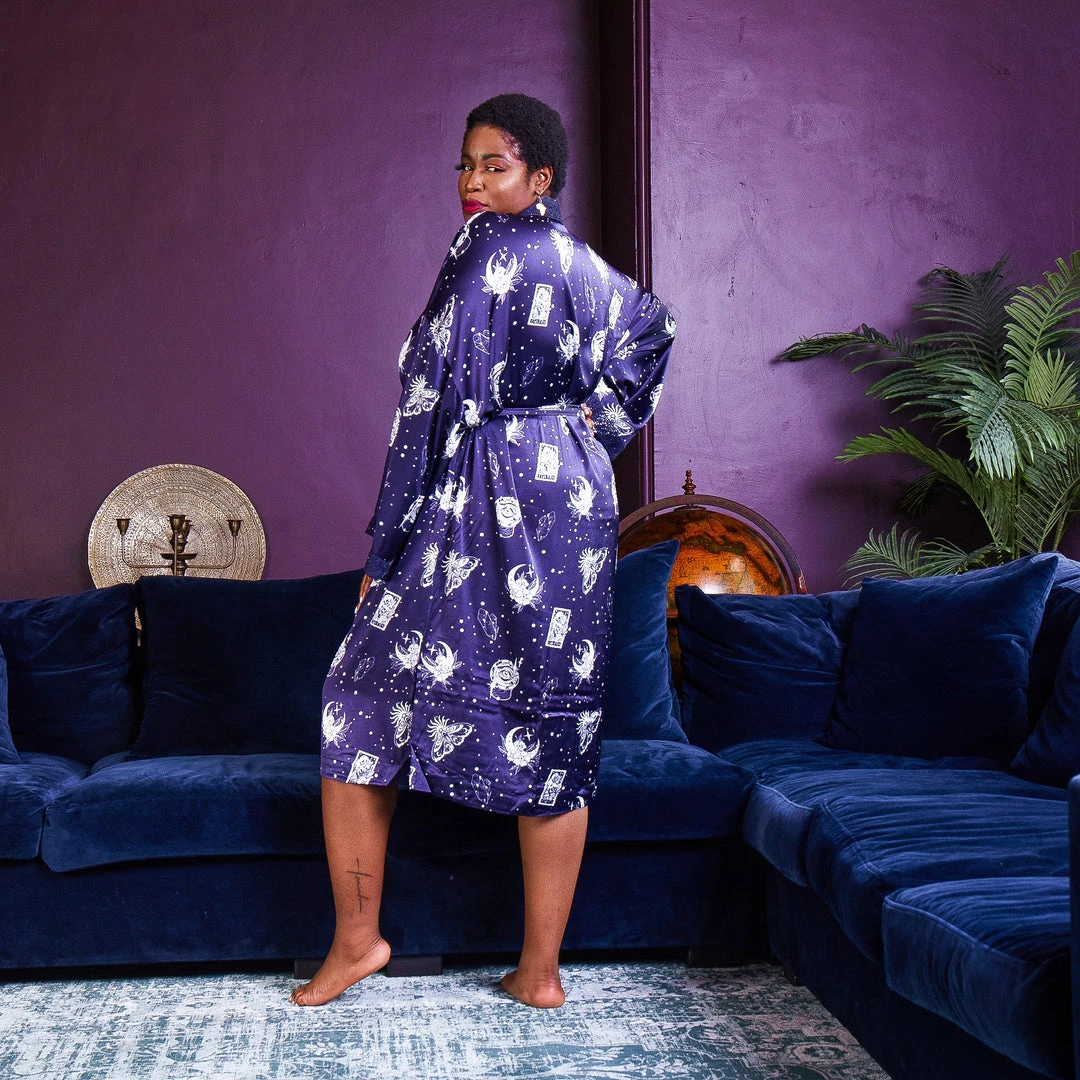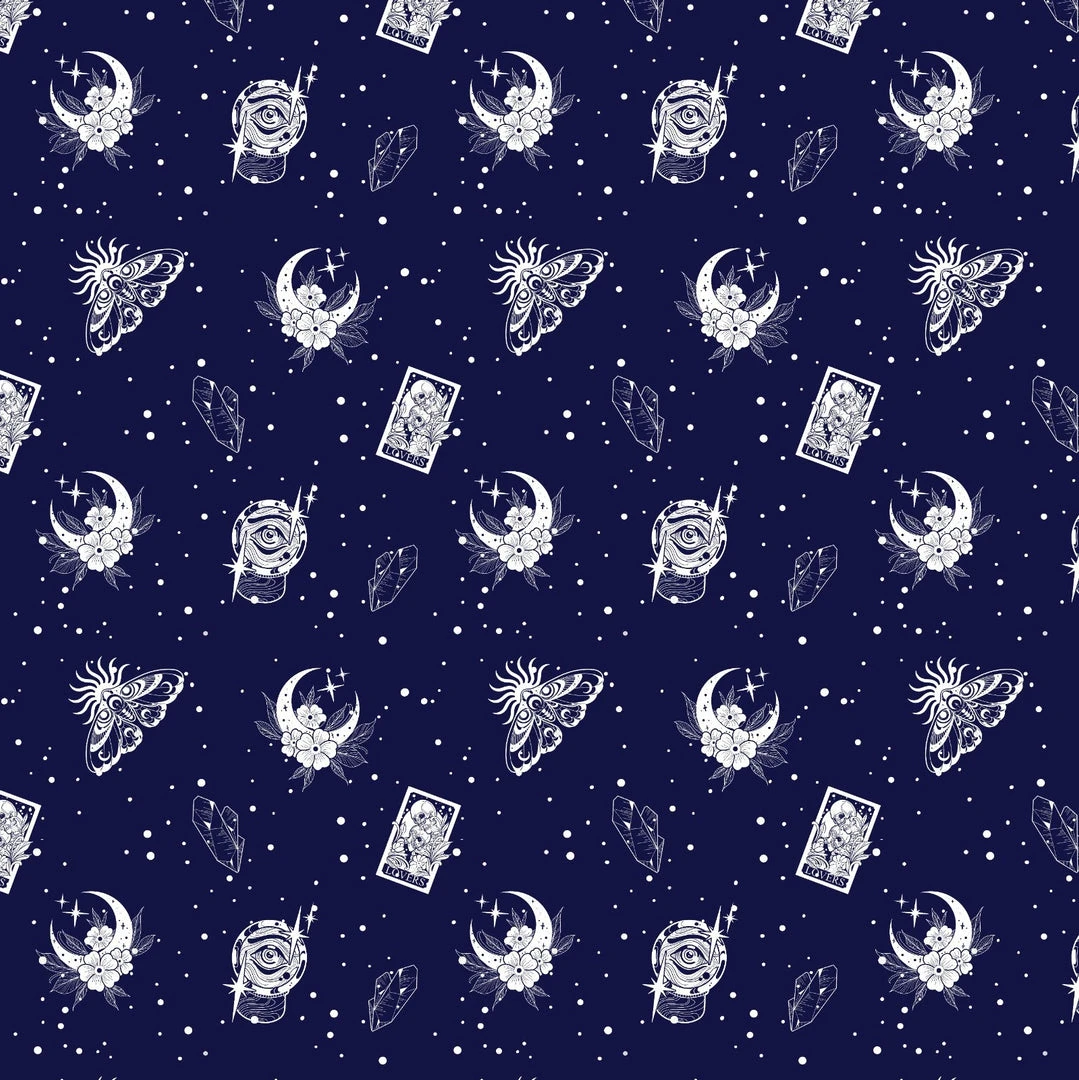 Made with 100% ethically sourced bamboo viscose, this magical mix of tarot, crystal, love and all things Divination, in navy and white, has been digitally printed and expertly designed by a talented independent tattoo artist.