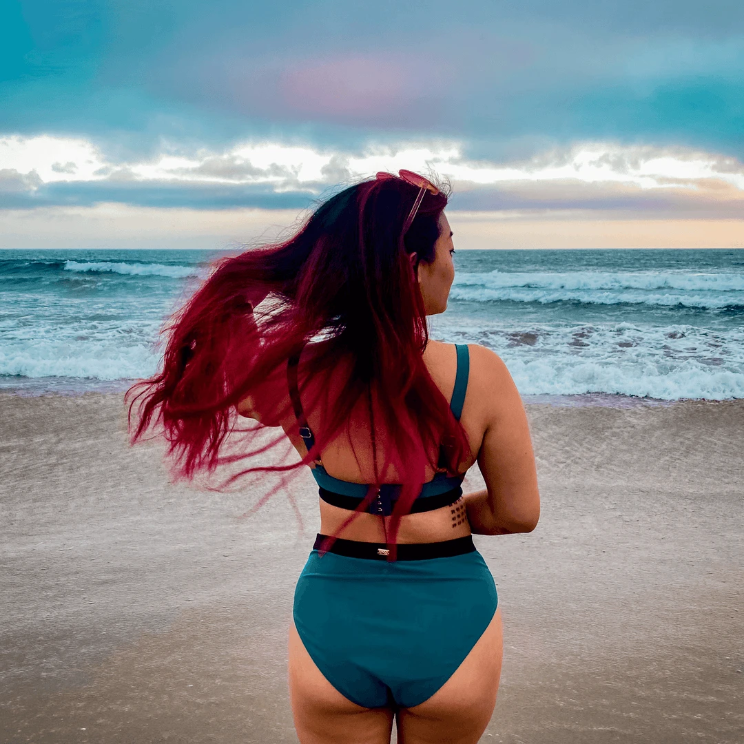 These gorgeous teal bikini bottoms with a black waistband which pulls up over the belly will have you saying ‘Hasta La Vista’ discomfort. Full coverage and complete comfort, just like Snaggler favourites Need for Speed, but this time without power mesh to allow for super stretch.